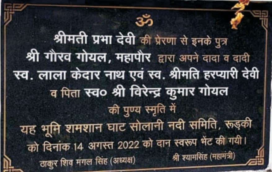 सन् 1925 के आसपास रुड़की का मेनबाजार पूरी तरह विकसित हो चुका था।द्वितीय विश्वयुद्ध के दौरान छोटी मुद्रा में कमी आ जाने पर तत्कालीन ब्रिटिश सरकार ने लाला केदारनाथ की बैंकर्स फर्म लाला लौती राम केदारनाथ को एक आना,दो आना,चार आना,आठ आना और बारह आना के सिक्के चलाने की अनुमति दे दी।लगभग तीन चार साल ये सिक्के पूरे सहारनपुर जनपद में चले।सन् 1960 में गौरव गोयल के ताऊ जी राजेन्द्र सेठ ने सिविल लाईन्स स्थित रुड़की के स्टेशन क्लब के लिए भूमि उपहार में दी।स्टेशन क्लब उच्चस्तरीय नागरिकों के लिए मनोरंजन,मेल मिलाप व उत्कर्ष का केंद्र बना।1944 में वर्तमान आर्य उपवन के लिए जमीन खरीदकर दिए जाने का विस्तृत उल्लेख अलग से दिया गया हैं।आपने अनेक तीर्थस्थलों पर अनेक मंदिरों,धर्मशालाओं में खुले हाथों से दान पुण्य किया।वर्ष 2022 में मेयर गोयल ने अपने जन्मदिन के अवसर पर सोलानी नदी श्मशान घाट समिति को लाखों रूपए कीमत की भूमि दान दी।उन्होंने अपने दादा-दादी,पिता की स्मृति में 2500 वर्ग फीट की भूमि संस्था को दान दी।शमशान घाट समिति इस भूमि का उपयोग सामाजिक कार्य के लिए कर रही है।