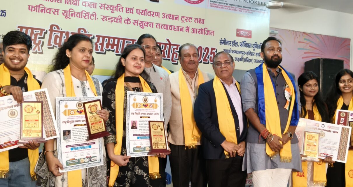 कला,शिक्षा,संस्कृती,साहित्य,विज्ञान,समाजसेवा,खेल,उद्यमिता,पत्रकारिता,ज्योतिष व अन्य महत्वपूर्ण क्षेत्रों में विशेष उपलब्धियां हासिल की हैं और अपने काम से समाज को गौरवान्वित किया है।देशभर के विभिन्न राज्यों से इन सक्रिय हस्तियों को अतिथिगणों द्वारा सम्मानित किया गया।देश के “प्रथम राष्ट्र विभूति सम्मान समारोह-2025” का आयोजन उत्तराखण्ड की हिमालय की गोद में माँ गंगा के तट पर विराजमान प्रसिद्ध शिक्षा नगरी रुड़की की पावन धरा पर फॉनिक्स यूनिवर्सिटी, रुड़की में किया गया,जिसमें कार्यक्रम के समन्वयक संजय वत्स ने तथा विश्वविद्यालय के चेयरमैन इंजी०चैरब जैन,कुलपति प्रो०मनीष पाण्डेय,प्रो०डॉ०पंकज कुमार मिश्रा,कुलपति फ्यूचर यूनिवर्सिटी बरेली, डॉ०प्रिया जाडू पूर्व निदेशक राज्य संसाधन केन्द्र उत्तराखण्ड,डॉ०बीएल यादव निदेशक सीएमडी इण्टरनेशनल स्कूल दिल्ली,डीके शर्मा निदेशक शेफील्ड स्कूल रुड़की,प्रदीप कुमार श्रीवास्तव व डॉ०नवीन खन्ना आदि अतिथियों द्वारा भारतवर्ष की शताधिक राष्ट्र विभूतियों को यह सम्मान स्मृति चिह्न,अंगवस्त्र,सम्मान की सूचक पगड़ी,हृदय फलक,प्रशस्ति पत्र तथा समय की सूचक घड़ी उपहार स्वरूप प्रदान कर विभूतियों को अलंकृत व्यक्तित्व में चार चांद लगाये।देश की महान् विभूतियों को सम्मानित कर रुड़की स्वयं गौरवांवित होकर ऐतिहासिक गौरवमय पलों का साक्षी बना।इस मौके पर प्रतिभावान विभूतियों के अनुकरणीय एवं सराहनीय कार्यों का ऐतिहासिक वंदन अभिनंदन तथा गुणगान किया गया।कार्यक्रम की अध्यक्षता इं०चैरब जैन ने की तथा मुख्य अतिथि शहीदे आजम भगत सिंह के भतीजे किरणजीत सिंह,विशिष्ठ अतिथि ‘प्रणाम पर्यटन’ के संपादक प्रदीप कुमार श्रीवास्तव,डॉ०प्रिया जाडू पूर्व निदेशक राज्य संसाधन केन्द्र प्रौढ शिक्षा उत्तराखंड,समाजसेवी डॉ०बीएल यादव रहे।सभी ने समस्त विभूतियों को शुभकामनाएँ एवं बधाइयों को साथ सम्मानित करते हुए उनके कृतकार्यों की सराहना की।कार्यक्रम में नन्हें जादूगर निपूर्ण ने भी दर्शक दीर्घा का मन आकर्षित किया तथा केके गर्ग द्वारा मधुर बांसुरी वादन ने सभागार को स्तब्ध कर आनन्दित किया।कार्यक्रम की सफलता के साक्षी चार सौ से अधिक विद्वज्जन रहे,जिनमें प्रमुख रूप से ट्रस्ट के अध्यक्ष जन्मेजय,सचिव श्रीमती सुमन चौहान,कोषाध्यक्ष श्रीमती कामना शर्मा,कार्यक्रम समन्वयक संजय वत्स,फॉनिक्स विश्वविद्यालय की डॉ०स्वाति चौधरी,डॉ०आयशा अंसारी सहित समस्त आचार्य वर्ग स्टाफ,विद्यार्थियों की उपस्थिति के साथ-साथ मध्यप्रदेश से मंजूषा गौतम,प्रमोद व्यास,दिल्ली से डॉ०अस्मिता आचार्य,इस्लाम मलिक,मख्खन लाल तंवर,प्रेम खुल्लर,डीपीखत्री,डा०प्रेम खुल्लर,श्रीमती निक्की गु