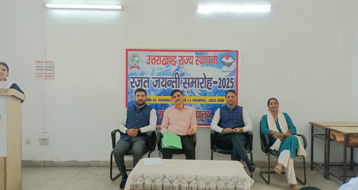 गुरु पर्व एवं कार्तिक पूर्णिमा महापर्व के शुभावसर पर उत्तराखंड संस्कृत विश्वविद्यालय में राज्य स्थापना सप्ताह समारोह पर आयोजित किए जा रजंत जयंती समारोह कार्यक्रम में द्वितीय दिवस में पोस्टर निर्माण प्रतियोगिता का आयोजन किया गया l प्रतियोगिता में प्रो बिंदुमति द्विवेदी एवं डॉ राजेश चंद्र सती ने निर्णायक के रूप में सभी प्रतिभागियों द्वारा उत्तराखंड राज्य को समर्पित पोस्टर निर्माण की सराहना की तथा कार्यक्रम के तृतीय दिवस स्वरचित काव्य पाठ प्रस्तुति प्रतियोगिता का आयोजन किया गया विद्यार्थियों ने अपनी प्रस्तुति में उत्तराखंड स्थापना ओर वर्तमान स्थिति को अपने काव्य रचना में प्रस्तुत किया तो वही पलायन के दंश पर दुख अभिव्यक्त करते हुये पहाड़ भाषा बोली के संरक्षण की बात कही डॉ सुशील चमोली एवं श्री अखिलेश मैठाणी ने निर्णायक मंडल के रूप में विद्यार्थियों के भावाभिव्यक्ति की सराहते हुए लेखन को निरंतर करने का निर्देश दिया कार्यक्रम के संयोजक डॉ सुमन प्रसाद भट्ट एवं संयोजिका श्रीमती मीनाक्षी सिंह रावत ने सभी प्रतिभागियों को बढ़ाई देते हुए व्यक्तित्व विकास के लिए आयोजित किये जा रहे सांस्कृतिक कार्यक्रमों में छात्रों की बढ़ती रूचि न केवल पीढ़ी को संवर्धित करती है अपितु विरासत के निर्माण में महत्वपूर्ण भूमिका निभाती है। कार्यक्रम में सुमन, मीनाक्षी, संदीप, रोहित,आलोक, दुर्गेश, प्रीतम, भास्कर,वंदना, स्नेहा, सोनी,जगपाल, हरिश्चंद्र इत्यादि सम्मलित हुये