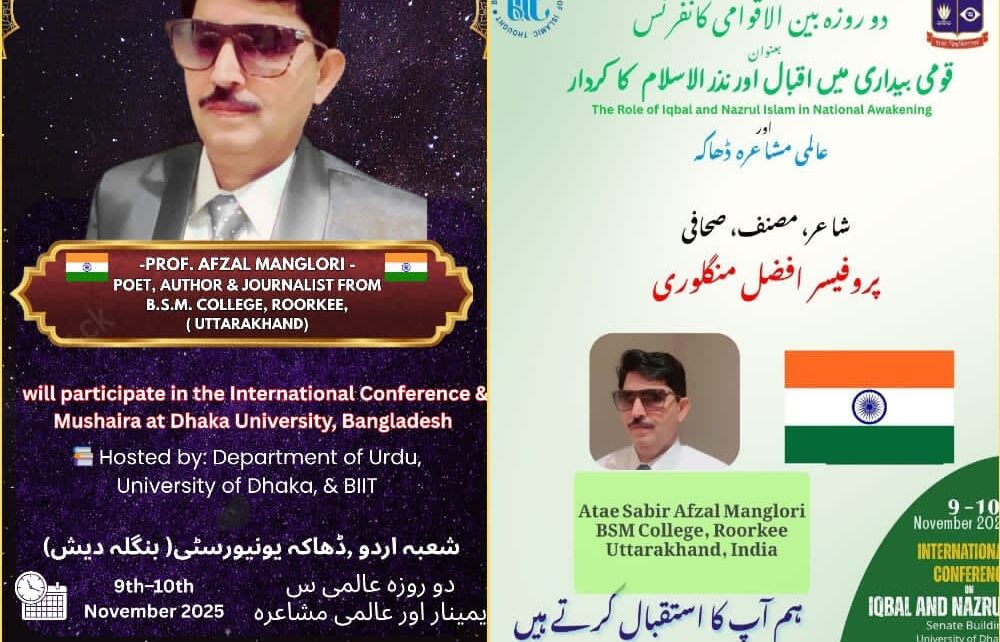 रुड़की।उत्तराखंड उर्दू अकादमी के पूर्व उपाध्यक्ष व अंतरराष्ट्रीय शायर अफजल मंगलौरी ढाका (बंगलादेश) में ढाका यूनिवर्सिटी में दो दिवसीय विश्व उर्दू सम्मेलन में भारत का प्रतिनिधित्व के ढाका पहुंच गए हैं।उन्होंने बताया कि इस विश्व स्तरीय सेमिनार में लगभग बाइस देशों के शायर,शिक्षक,बुद्धिजीवी और लेखक भाग ले रहे हैं।ढाका यूनिवर्सिटी के उर्दू विभाग के अध्यक्ष प्रोफेसर गुलाम रब्बानी की सूचना के अनुसार बांग्ला कवि काजी नजरुल इस्लाम और उर्दू शायर डॉ०इकबाल की आजादी के आंदोलन में सेवाओं और योगदान पर विश्व सेमिनार और अंतरराष्ट्रीय मुशायरा भी आयोजित किया जाएगा।इस सम्मेलन में ईरान,मलेशिया,दुबई, स्वीडन,नॉर्वे,मॉरीशस,मिस्र,तुर्की,इंग्लैंड,अमेरिका,नेपाल व पाकिस्तान सहित कुल बाइस देशों के विद्वान राष्ट्रीय जनजागरण में कवि नजरुल इस्लाम व इकबाल के योगदान पर चर्चा करेंगे। अफजल मंगलौरी इस सेमिनार में उत्तराखंड के प्रथम कवि है,जो बंगलादेश में साहित्यिक संगोष्ठी में भाग ले रहे हैं।ज्ञात रहे कि अफजल मंगलौरी इससे पूर्व गत तीन माह पहले दुबई,शारजाह ,काठमांडू (नेपाल)में भी भारत की ओर से शिरकत कर चुके हैं, जहां उनको कई सम्मान प्राप्त हो चुके हैं।भारत की ओर से दिल्ली से प्रोफेसर ख्वाजा इकराम,जम्मू कश्मीर से डा०नसीब अली चौधरी भी इस विश्व उर्दू सम्मेलन में भाग लेने ढाका पहुंच गए हैं।