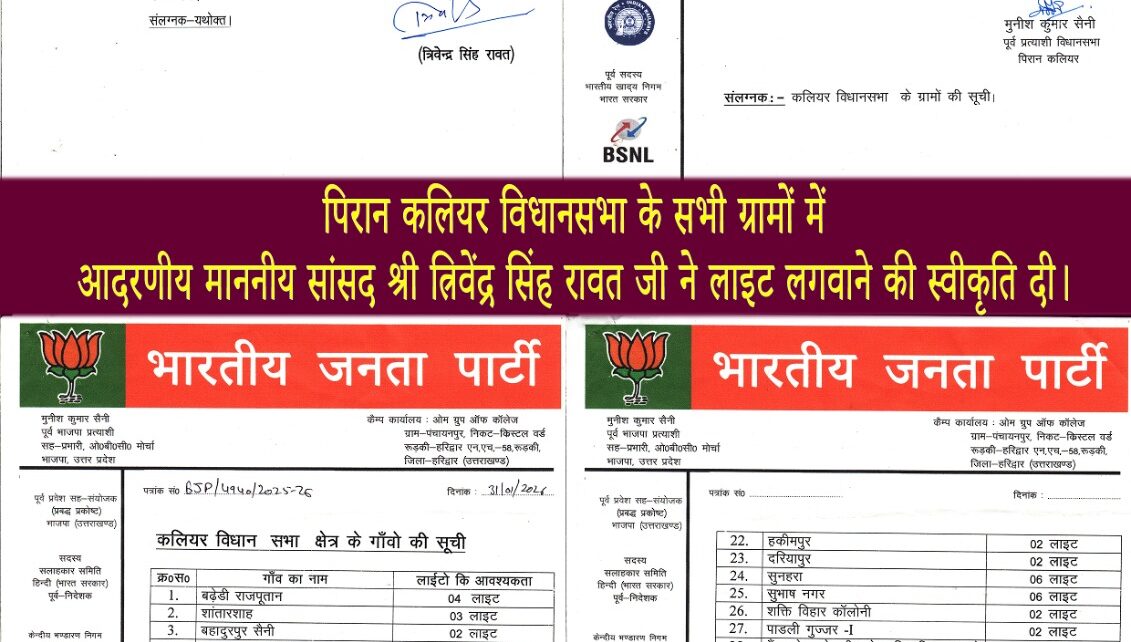 हरिद्वार कलियर विधानसभा के पूर्व भाजपा प्रत्याशी मुनीश सैनी ने एक पत्र लोकसभा सदस्य त्रिवेंद्र सिंह रावत को लिखा की कलियर विधानसभा के प्रत्येक गांव व चौराहों पर आम पब्लिक की सुविधा के लिए लाइटों का इंतजाम किया जाए