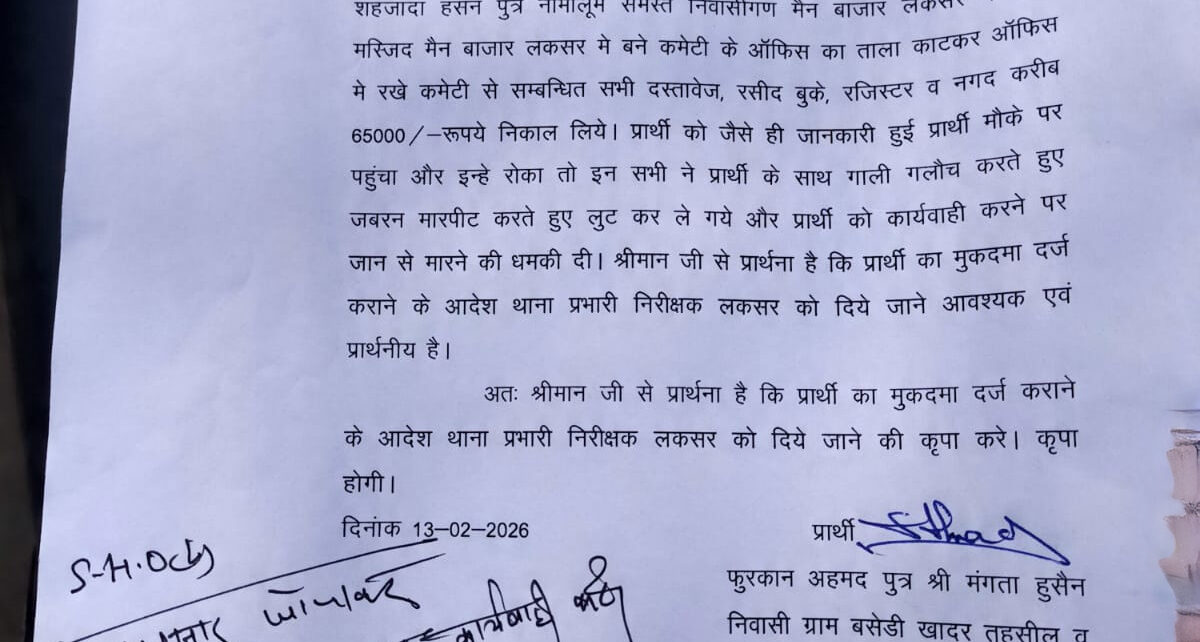 लक्सर जामा मस्जिद में ताला तोड़ने का सनसनीखेज मामला: 65 हजार रुपये और दस्तावेज गायब कमेटी सचिव को पीटा-धमकाया लक्सर के मैन बाजार स्थित ऐतिहासिक जामा मस्जिद के कमेटी कार्यालय में सुबह-सुबह उपद्रवियों का तांडव मच गया। एक गुट ने ताला तोड़कर अंदर घुसकर नकदी सहित 65 हजार रुपये, महत्वपूर्ण दस्तावेज, रसीद बुक और रजिस्टर […]